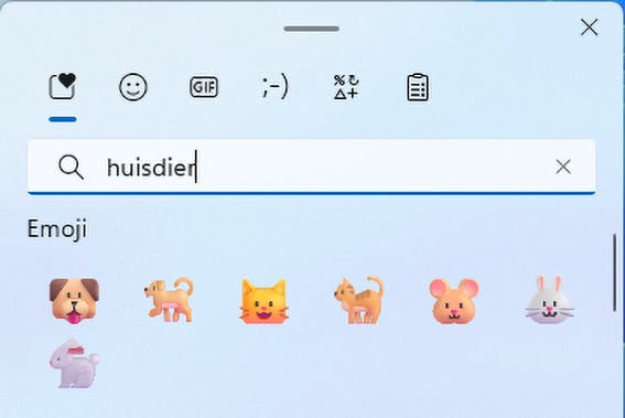 Voeg voortaan kinderlijk eenvoudig emoticons aan een e-mail of chatbericht toe. Druk gewoon op de sneltoets Windows-toets +. (punt) om een klein keuzemenu met emoji te tonen. Je tikt in de zoekbalk eventueel Nederlandse trefwoorden om specifieke emoticons te vinden. Typ je bijvoorbeeld Huisdier, dan kun je een plaatje van een hond, kat of konijn selecteren. Verder bevat de bibliotheek ook bewegende gif-plaatjes. Dubbelklik op een item om het toe te voegen.
