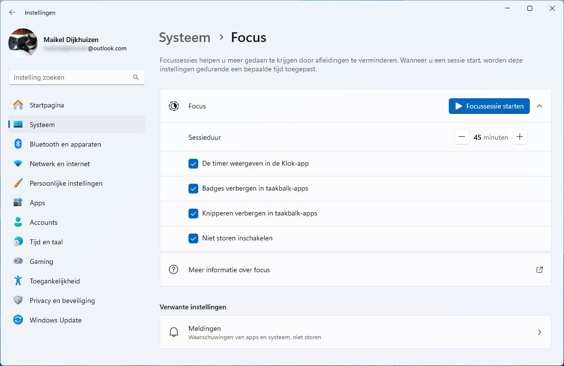 De zogeheten Focussessie helpt je om geconcentreerd te werken. Deze modus blokkeert onder andere inkomende meldingen en badges van apps. Hierdoor kom je niet in de verleiding om tussendoor tóch even iets anders te doen. Navigeer naar Instellingen / Systeem / Focus. Bij Sessieduur staat er een standaardtijd ingesteld van dertig minuten, maar dat pas je met de plus- en minknoppen naar eigen wens aan. Neem ook de overige opties door. Hoe meer onderdelen je aanvinkt, hoe minder je wordt afgeleid. Bevestig ten slotte met Focussessie starten.