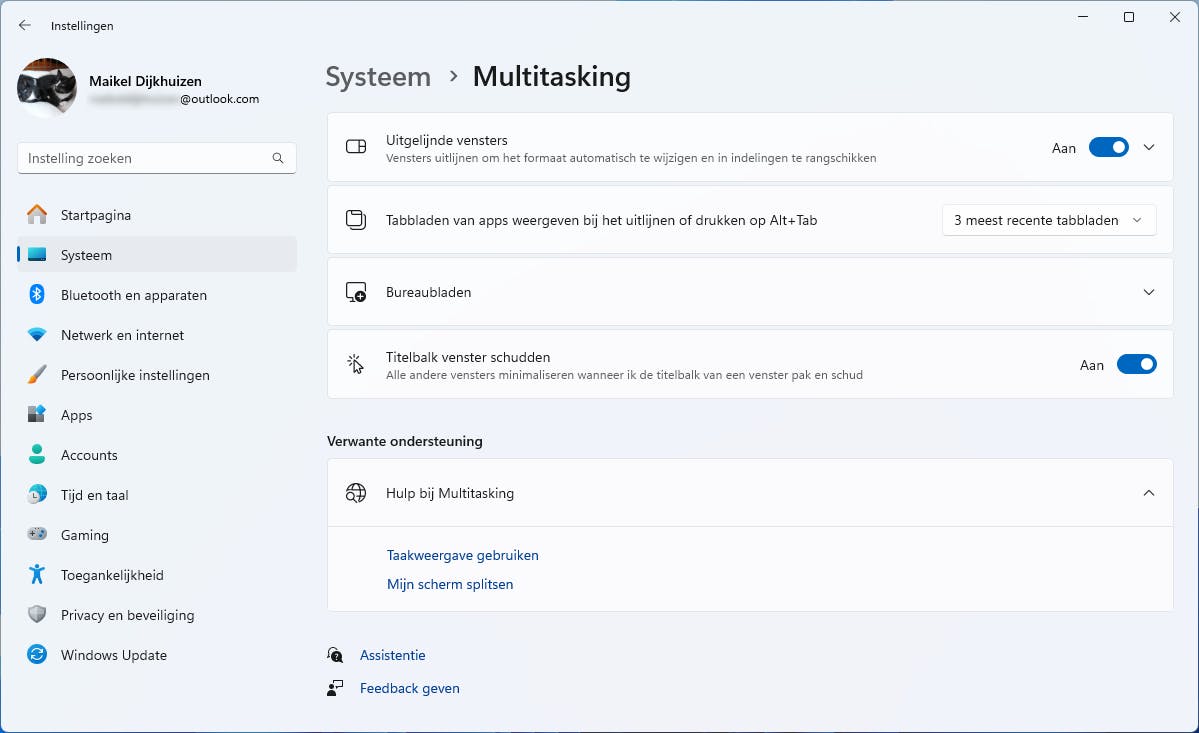 Staat je scherm vol met geopende vensters? In eerdere Windows-versies kon je alle apps razendsnel minimaliseren. Je hoefde hiervoor alleen de titelbalk van een programma te schudden. Windows 11 beschikt ook over deze functie, maar die staat standaard uit. Ga via Instellingen / Systeem naar Multitasking en activeer het schuifje achter Titelbalk venster schudden. Klik nu op de titelbalk van een programma en houd de muisknop ingedrukt. Beweeg de muis vervolgens snel heen en weer. Hiermee minimaliseer je alle andere geopende programma’s naar de taakbalk, behalve het huidige venster.