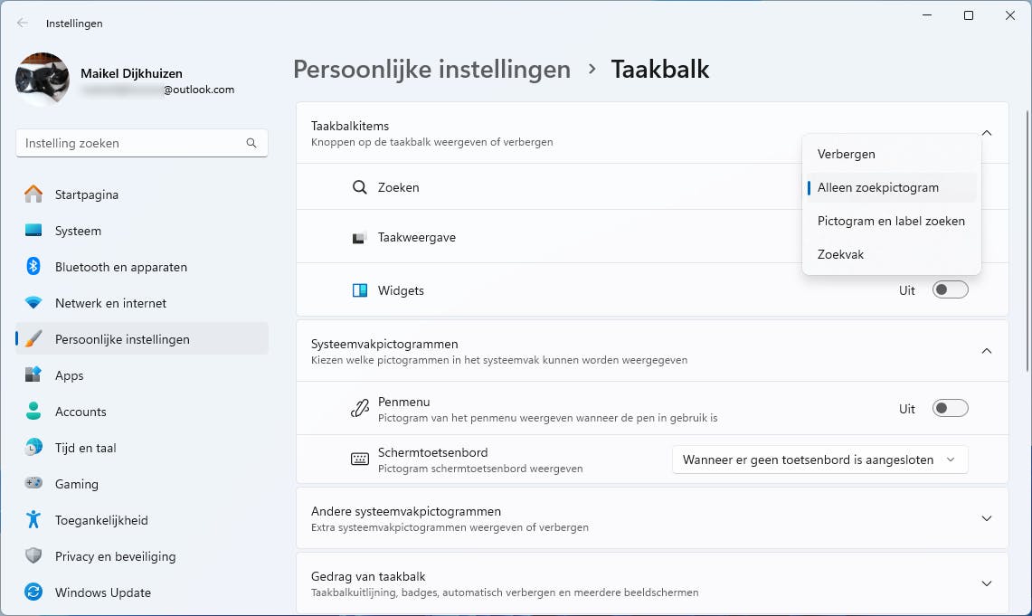 Op de taakbalk bevinden zich diverse pictogrammen, zoals Zoeken, Taakweergave, Widgets en misschien ook Copilot. Wie deze onderdelen nooit gebruikt, kan ze net zo goed verbergen. Klik met de rechtermuisknop op de taakbalk en kies Taakbalkinstellingen. Je kunt de zoekfunctie op verschillende manieren weergeven. Klik bij Zoeken op het uitrolmenu en kies Alleen zoekpictogram, Pictogram en label zoeken of Zoekvak. Je kunt ze ook allemaal even uitproberen, want elke wijziging is direct zichtbaar. Via Verbergen verdwijnt de zoekfunctie helemaal uit beeld. Bepaal met de schuifjes achter Taakweergave, Widgets en eventueel Copilot in hoeverre je deze onderdelen wilt weergeven.