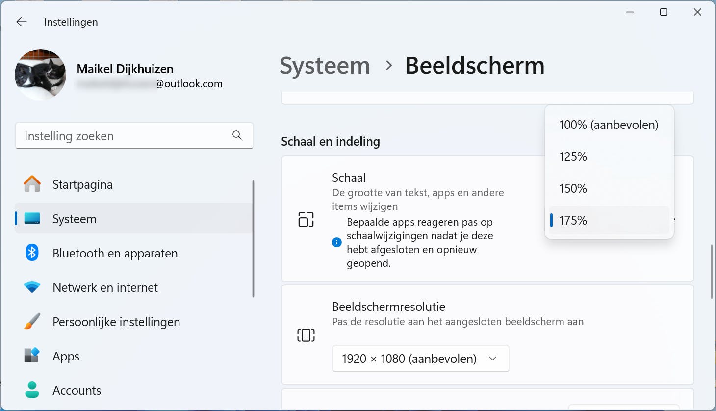 Met een schaalgrootte van 175 procent verschijnen teksten en menu-onderdelen nogal groot in beeld.