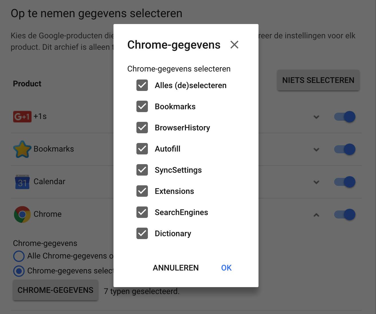 Bij enkele onderdelen waar subselecties mogelijk zijn, vind je onder de kolom Details de mogelijkheid om aan te duiden welke onderdelen je precies wilt downloaden. Bij Calendar kun je bijvoorbeeld aanduiden of je alle of slechts bepaalde agenda’s wilt downloaden. Bij Google Photos heb je de mogelijkheid om bepaalde albums te selecteren. En kies je Chrome, dan kun je alle persoonlijke gegevens downloaden of alleen de bookmarks, de extensies, de auto-fill-gegevens enzovoort.