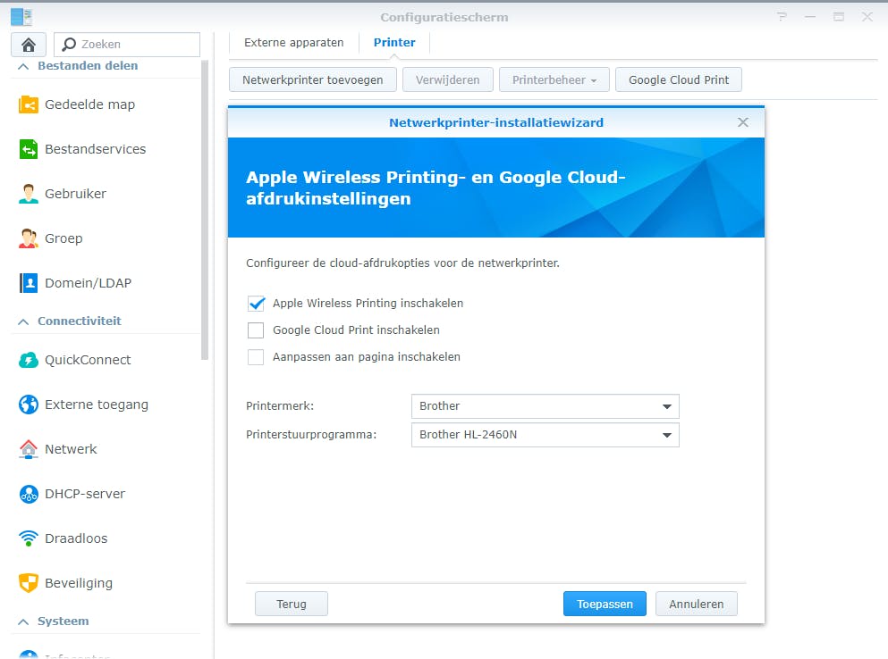 Overigens tref je hier naast de AirPrint-functie ook nog de optie Google Cloud Print inschakelen aan. Dat maakt het mogelijk om zelfs van buitenshuis via internet naar je thuisprinter af te drukken, met je nas als tussenstation.