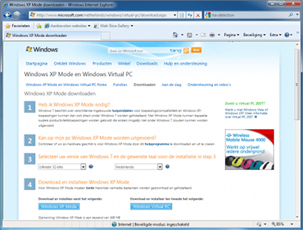 Surf naar de Virtual PC- en XP-Mode-website. Selecteer als besturingssysteem Windows 7 Ultimate, kies 32 of 64 bit en selecteer Nederlands. Download en installeer alléén Windows Virtual PC. Herstart tot slot uw pc.