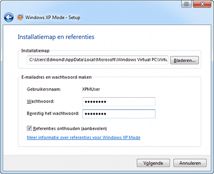 Na de installatie vindt u in het menu Start het nieuwe onderdeel Windows Virtual PC, met daarbinnen Windows XP Mode. Start Windows XP Mode en bevestig de licentievoorwaarden. In het volgende scherm moet u een wachtwoord opgeven en bevestigen. Belangrijk is hierbij dat u de optie Referenties onthouden ingeschakeld laat. Dan werkt XP Mode in de toekomst het gemakkelijkst en met de minste pop-up-vensters. Kies voor Beveilig mijn computer beter door Automatische updates nu in te schakelen (aanbevolen). Kies tot slot voor Setup starten. De set-up van Windows XP Mode wordt nu afgerond, dit kan meerdere minuten duren.