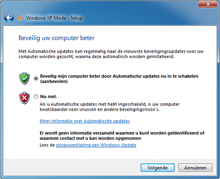 Ook een besturingssysteem in een virtuele machine moet worden geüpdatet en voorzien van een antivirusprogramma. Want hoewel XP Mode in een digitale zandbak draait, heeft de applicatie verbinding met het internet en is het direct verbonden met de schijven in uw pc. Daarom is het belangrijk ook binnen de virtuele machine de updates van Windows Update te downloaden en installeren. Om het besturingssysteem in de virtuele machine te beschermen tegen virussen kunt u bijvoorbeeld de gratis Microsoft Security Essentials installeren (www.microsoft.com/security_essentials).