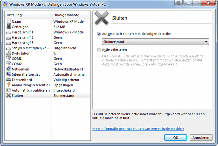 U kunt zelf bepalen welke actie volgt op het afsluiten van het Virtual PC-venster.