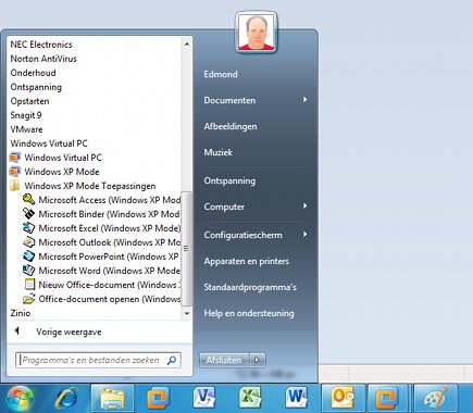 De programma's die in de XP Mode zijn geïnstalleerd, kunt u direct uit het menu Start van Windows 7 starten.