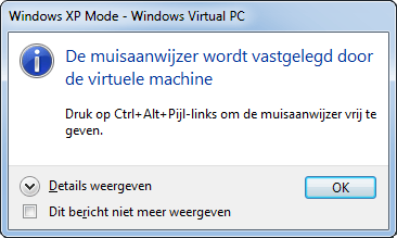 Zolang de integratiefuncties nog niet zijn geïnstalleerd, komt een muis vast te zitten in het venster van een virtuele machine als u een paar keer geklikt hebt. Om de muis 'te bevrijden', houdt u de knoppen Ctrl en Alt ingedrukt en drukt u tegelijkertijd op het pijltje naar links. Wilt u weer klikken in de virtuele machine, beweeg de muis naar het venster van de virtuele machine en klik één keer om de muis in de virtuele machine te kunnen gebruiken.
