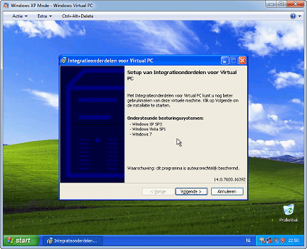 XP Mode aan de praat gekregen? Dan is het tijd om de Integratiefuncties in te schakelen. Deze zorgen ervoor dat XP Mode en Windows 7 naadloos samenwerken. Klik in het venster van Windows Virtual PC op Extra / Integratiefuncties inschakelen. U zult nu merken dat alle schijven in de computer ook in de Verkenner van de virtuele machine te zien zijn. Verder is het nu onder meer mogelijk om vanuit de virtuele machine te printen, zijn de beveiligingsmeldingen in de virtuele machine in het beveiligingscentrum van Windows 7 te zien zijn en kunt applicaties die in een virtuele machine zijn geïnstalleerd, direct vanuit Windows 7 starten en gebruiken.