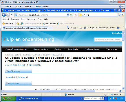 Wat nog ontbreekt, is Windows Virtual PC, het programma om de virtuele XP-machine te kunnen starten. Klik op de website van Windows XP Mode en Virtual PC op Windows Virtual PC om de download te starten. De bestandsomvang bedraagt 10 MB, zodat u deze gerust direct kunt Openen. Virtual PC wordt, verwarrend genoeg, als een Windows-update geïnstalleerd, inclusief verwijzingen naar een Knowledge Base-artikel van Microsoft.