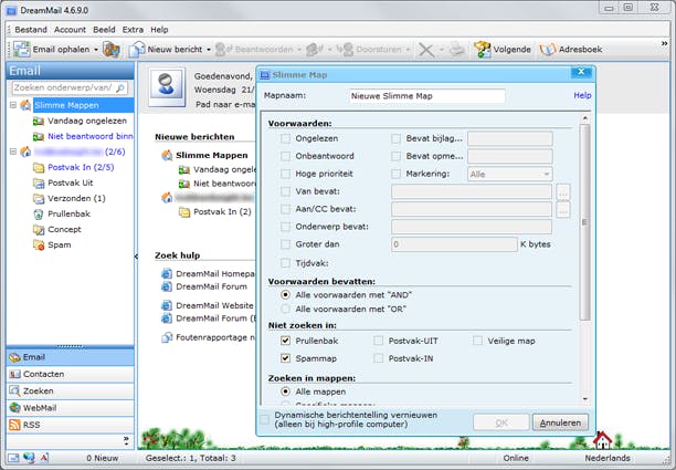 De interface laat zich klassiek noemen, met een typische driedeling: links het paneel waarin u de gewenste e-mailmap of -account opent, rechtsboven de inhoud van de mailmap en rechtsonder een voorvertoning van het bericht. Berichten laten zich op verschillende criteria sorteren, maar het moet netjes blijven en dus voorziet het programma ook in een uitgebreide filterset en handige 'slimme mappen'. U bepaalt zelf de criteria en DreamMail zorgt er automatisch voor dat alleen de juiste berichten in zo'n map terechtkomen. Voor wie minder strak werkt: er is een flexibele zoekfunctie aanwezig waarmee u snel de gezochte berichten opspoort. Over de verdiensten van de spamknop zijn we minder te spreken: die fungeert eigenlijk alleen als 'voeg deze afzender aan de zwarte lijst toe'.