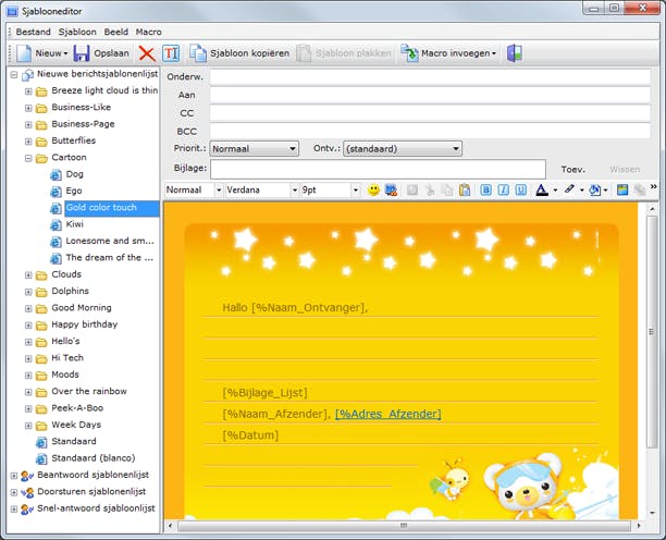 E-mails verstuurt u standaard in HTML-formaat en hier treft u een paar leuke extra's aan. We hebben het dan niet zozeer over de (rijke verzameling) emoticons, de fraaie briefpapieren (zo'n 85-tal, netjes thematisch verdeeld) maar over de mogelijkheid om snel een tabel, een schermafbeelding of ingesproken tekst (in wav-formaat) toe te voegen. Er zijn tevens kant-en-klare sjablonen en uiteraard kunt u handtekeningen toevoegen en - best handig - met behulp van macro's past u daar bovendien variabelen in zoals [%Datum] of [%Naam_Ontvanger]. En voor wie de overstap maakt: DreamMail laat u toe berichten uit Outlook Express en Foxmail te importeren.