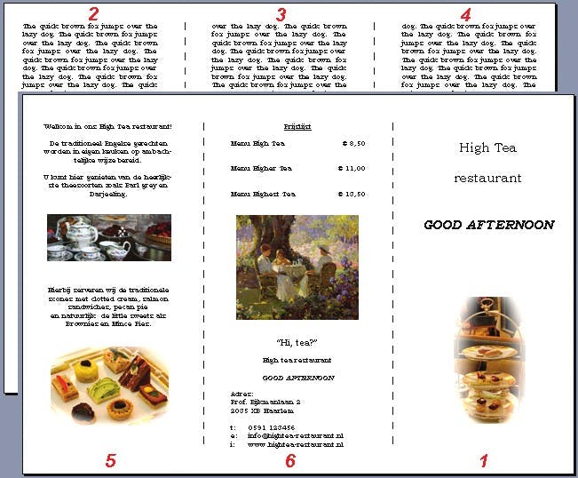 Om na het vouwen de folder goed te krijgen, is belangrijk wat u in welke kolom typt. Is de folder dichtgevouwen, dan ziet u het titelblad; de rechterkolom van het eerste blad. De achterkant van de folder is bladzijde 6, die komt hier in het midden. Die bevat adres, telefoonnummer en dergelijke. Als de lezer de folder openvouwt, moet hij/zij meteen pakkende informatie zien; die komt op bladzijde 5 (de linkerkolom). Op de andere kant van het papier komt de hoofdtekst, op bladzijde 2, 3 en 4. Daar typt u het saaiere, informatieve deel. Kijk naar de rode paginanummers in afbeelding 2. U kunt het geheel opfleuren met digitale afbeeldingen en foto's. Die moeten niet breder zijn dan één kolom, dus maximaal 6,9 cm (zoals u in afbeelding 1 bij Breedte ziet). Wilt u de rechterkant van de tekst minder rafelig maken, dan laat u de tekst afbreken. Klik op Extra, Taal en Woordafbreking en schakel de optie Woorden in document automatisch afbreken in (Word 2007: tabblad Pagina-indeling, klik op Afbreken en Automatisch). Om de rechterkant van de gehele tekst strak te krijgen selecteert u alles (sneltoets: Ctrl + A) en klikt u op Uitvullen (sneltoets: Ctrl + J). Om de titel op de rechterkolom van het eerste blad te krijgen drukt u aan het eind van bladzijde 6 een aantal keren op Enter, maar als u aan de tekst ervoor iets toevoegt, zal de titel opschuiven. Voeg dus liever een zogeheten kolomeinde in. Plaats hiervoor de cursor aan het eind van de tekst op bladzijde 6 en klik op Invoegen, Eindemarkering en Kolomeinde (Word 2007: tabblad Pagina-indeling, Eindemarkeringen, Kolom). Of druk op de sneltoets Ctrl + Shift + Enter. Nu springt de titel naar de laatste kolom en blijft stevig op bladzijde 1. Eindigt uw tekst al op bladzijde 5, dan voegt u twee kolomeinden in.