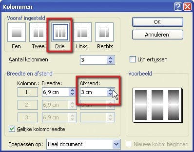 U krijgt de werkwijze voor zowel Word 2003 als voor de nieuwste versie Word 2007 (die noemen we tussen haakjes). Op één kant van een liggende A4 komen drie kolommen. Iedere kolom wordt een bladzijde van uw folder. Open in Word een nieuw document en klik op Bestand, Pagina-instelling (in Word 2007: klik in het tabblad Paginaindeling op Marges en op Aangepaste marges), kies onder Afdrukstrand voor Liggend en zet de vier marges rondom op 1,5 cm. Voor drie kolommen klikt u op Opmaak, Kolommen (Word 2007: Kolommen, Meer Kolommen) en kiest u Drie. Tussen twee kolommen komt steeds een vouw. Om links en rechts van de vouw een marge te krijgen, moet de ruimte tussen de kolommen twee keer zo breed worden als de zijmarges. Kies daarom bij Afstand 3 cm (afbeelding 1).