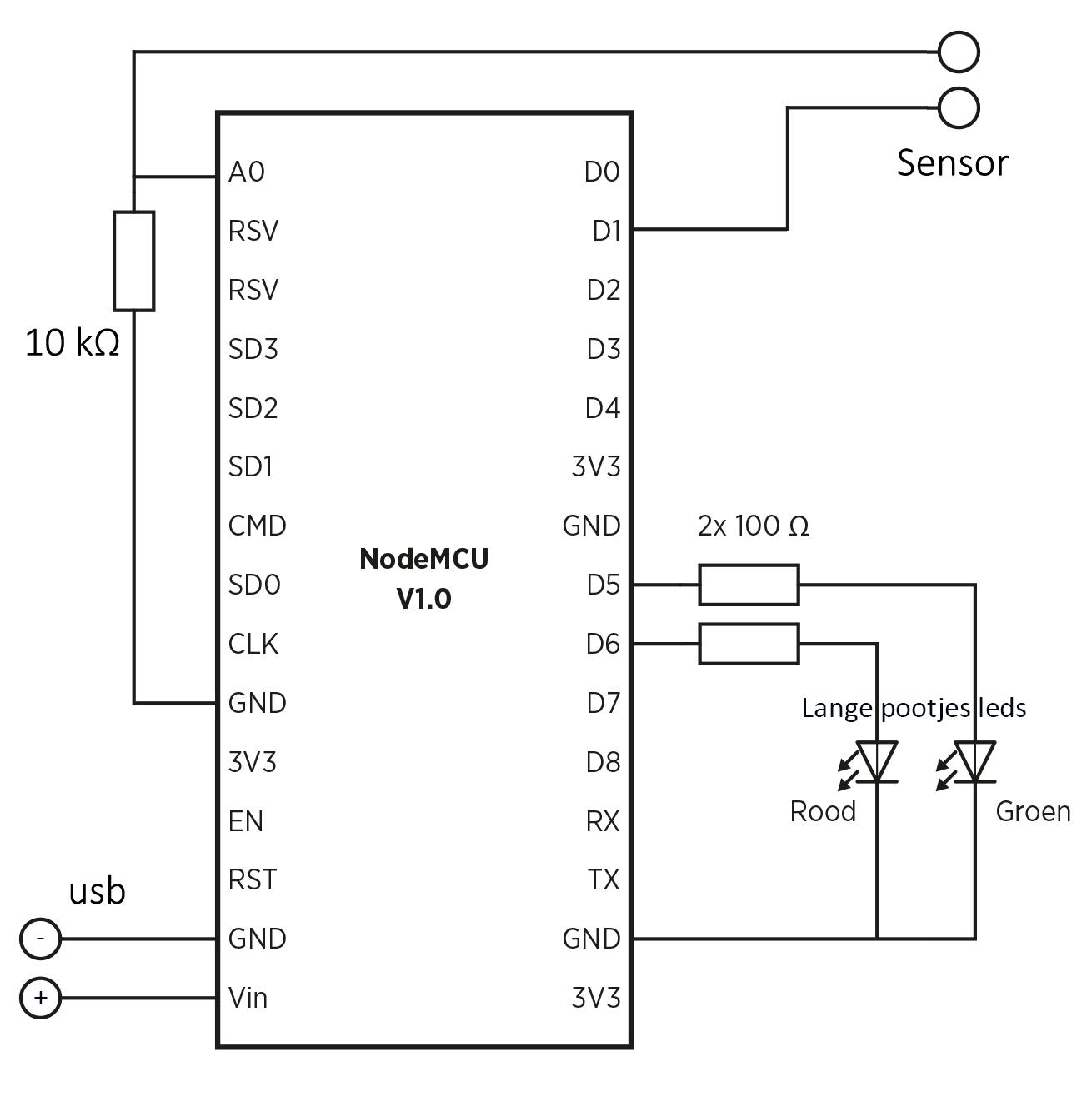 Sluit de anode (het lange pootje) van de groene led via een weerstand van 100 ohm aan op D5 en de anode van de rode led via een weerstand van 100 ohm op D6. Verbind de kathodes (korte pootjes) van beide leds met GND. Sluit een weerstand van 10 kilo-ohm aan tussen A0 en GND, de sensor komt tussen A0 en D1. Van de netvoeding van 5 volt verbind je de plus met VIN en de min op GND.