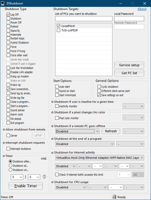 Alle acties kun je laten uitvoeren na een instelbare tijd, maar ook op een specifiek tijdstip, al dan niet herhaald. Zo’n actie hoeft overigens niet altijd tijdsgebonden te zijn. Je kunt als voorwaarde bijvoorbeeld ook instellen dat een specifieke pixel van kleur verandert, dat een bepaalde netwerkadapter een zekere hoeveelheid data heeft geüpload of gedownload, of dat een programma je cpu te veel of te weinig belast. De tool stelt je verder in staat andere pc’s in je netwerk af te sluiten, op of na een bepaalde tijd of wanneer die offline gaat. Je moet er dan wel ook voor zorgen dat er geen firewall in de weg zit.