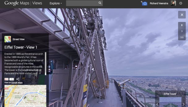 Een functie die gerelateerd is aan Google Maps is Google Views. Het gaat hier om interactieve beelden van bijvoorbeeld musea, oceanen en bekende attracties. Ga naar http://www.google.com/maps/views en klik op Explore. Selecteer bijvoorbeeld Eiffel Tower en je ziet een bewegende foto vanaf het uitzicht-platform van de Eiffeltoren. Klik op het pijltje rechtsboven in de foto om het beeldvullend te maken. Door op 2, 3 of 3,5 te klikken, wissel je van platform. Klik en sleep met je muis om interactief het uitzicht te veranderen.