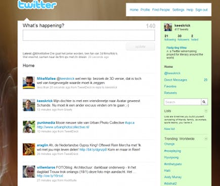Dankzij Twitter kunt u op eenvoudige wijze mensen volgen in hun dagelijkse doen en laten. De een laat slechts sporadisch iets van zich horen; de ander stort elk uur een lawine aan berichten de wijde wereld in. Na het aanmelden bij Twitter ziet u rechtsboven het aantal mensen dat u zelf volgt (following) en hoeveel mensen op uw berichten geabonneerd zijn (followers). Klik erop om de namenlijst te zien. Aangezien u zelf bepaalt wie u wel en niet volgt, is het lijstje bij following heel goed in de hand te houden.