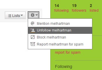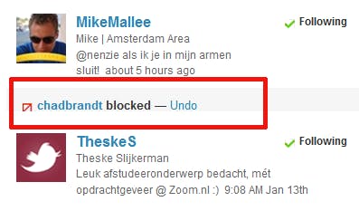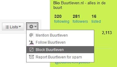 De lijst followers rechtsboven in het scherm kan ongemerkt groeien en daar hebt u weinig grip op. Anders dan bij veel andere netwerken kan bij Twitter iedereen op eigen houtje besluiten om u te gaan volgen. Dus zonder u daar eerst voor om toestemming te vragen. Bekijk het lijstje daarom met regelmaat om te zien wie er allemaal op staan. Wilt u, om welke reden dan ook, dat iemand u niet meer kan volgen, klik dan op het gereedschapspictogram en kies Block. In de praktijk gebruikt u dit voornamelijk tegen spammers.