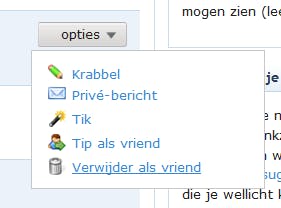 Om mensen waar u nog maar weinig binding mee hebt uit uw netwerk te verwijderen, klikt u in de menubalk onder het logo van Hyves op Vrienden / Vrienden beheren. U krijgt netjes iedereen te zien. Zodra u de muis over een vriend beweegt, verschijnt er aan de rechterkant een knop genaamd opties. Klik hierop en kies Verwijder als vriend om van die vriend een ex-vriend te maken. Een andere leuke optie is Tip als vriend, waarmee u iemand juist aanbeveelt, zodat vrienden uit uw netwerk nader kunnen kennismaken.