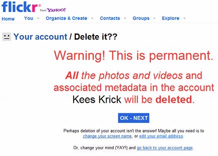 Om te zien wie u allemaal geblokkeerd hebt, klikt u onderaan de contactlijst op Your Block List. Uw volledige Flickr-account weggooien kan eenvoudig via de menuoptie You / Your account. Onderaan in het tabblad Personal information vindt u in rood de optie Delete your Flickr account. Ook uw foto's en films worden dan van Flickr verwijderd. Tabblad Privacy & Permissions gebruikt u om aan te geven wat anderen mogen zien en doen. Bijvoorbeeld welke informatie in uw profiel openbaar is, en wie uw foto's mogen bekijken en van commentaar voorzien.