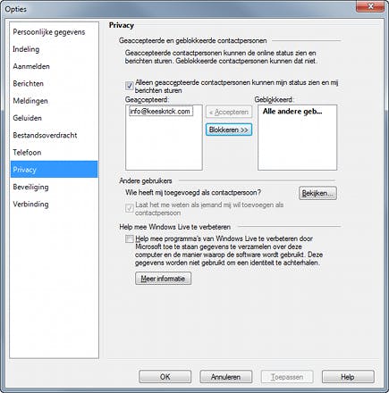 In Windows Live Messenger is een klik op een contactpersoon voldoende om die persoon uit de lijst te verwijderen of te blokkeren. Geblokkeerde personen kunnen uw online status niet zien en ook geen gesprekken met u voeren. Klik in het Messenger-venster op het pijltje achter uw naam (de schermnaam), kies Opties en klik vervolgens in de linkerkolom op het kopje Privacy. Hier stelt u nog sneller in welke contactpersonen geaccepteerd dan wel geblokkeerd zijn. Via de knop Bekijken ziet u bij wie u in de lijst van contactpersonen staat.