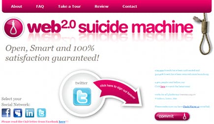 Bent u het virtuele sociale leven helemaal zat? Dan kan het veel werk zijn om uzelf bij elk netwerk waar u een profiel hebt aangemaakt af te melden. Het kan een stuk sneller en gemakkelijker door digitaal zelfmoord te plegen via de 'Web 2.0 Suicide Machine' (zelfmoordmachine dus). U laat het vuile werk dan voor u opknappen. Pas wel op, want nadat u eenmaal begonnen bent, is er geen weg meer terug! Op dit moment worden Hyves en Flickr nog niet ondersteund, maar wel Facebook, MySpace, Linkedin en natuurlijk Twitter.