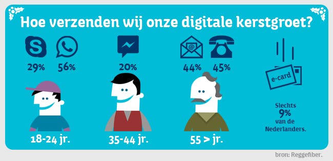 Nee dus. Reggefiber (van de glasvezel) vroeg aan ruim duizend Nederlanders hoe zij de kerstgroet overbrengen. Een groot deel van de Nederlanders geeft vrienden en familie die ver weg wonen liever een digitale kerstgroet dan een kerstkaart per post. Vooral een WhatsAppje sturen, een e-mail schrijven of een Skype-gesprek opzetten zijn populair. Het traditionele telefoontje met Kerst blijft echter het populairst. Het aloude bellen is vooral bij oudere Nederlanders populair. Ook versturen zij vaker een sms’je of een e-mail tijdens de Feestdagen. In de leeftijdsgroep 35 tot 45 jaar wordt opvallend vaak gekozen voor Facebook Messenger, namelijk door één op de vijf.