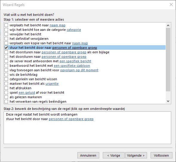 Nu moet je de voorwaarde(-n) aanduiden waaraan de e-mailberichten moeten voldoen om de regel toe te passen. Als je alle binnenkomende e-mail wilt doorsturen, dan vink je geen enkele voorwaarde aan en sla je deze stap over. Ga even door het lijstje heen, want er staan enkele interessante mogelijkheden tussen. Bijvoorbeeld alle e-mail die alleen aan jou persoonlijk is verzonden, of e-mail met een specifieke tekst in het onderwerp, of e-mail afkomstig van bepaalde personen of van een groep … Daarna vraagt de wizard wat je met de berichten wilt doen die aan deze voorwaarde(-n) voldoen. Voor het doorsturen heb je twee mogelijkheden. Of je kunt de binnenkomende e-mail als bijlage doorsturen, of je kunt deze berichten als normale e-mail doorsturen. In het vak onderaan klik je op de blauwe link personen of openbare groep en vervolgens opent het adresboek, waar je de persoon of de groep selecteert naar wie je de berichten wilt doorsturen. Het is mogelijk om in het vak Aan een nieuw e-mailadres te typen. Daarna klik je op Volgende.