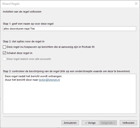 In de volgende stap kun je uitzonderingen opgeven. Bijvoorbeeld als je niet wilt dat de berichten van je partner ook worden doorgestuurd, of wanneer je naam alleen maar in cc staat. In de laatste stap geef je de regel een naam, zodat je over enkele weken nog weet waarvoor hij staat. Ten slotte kun je eventueel aanvinken of de regel moet worden toegepast op de berichten die al aanwezig zijn in Postvak In. In de meeste gevallen wil je dat laatste niet.