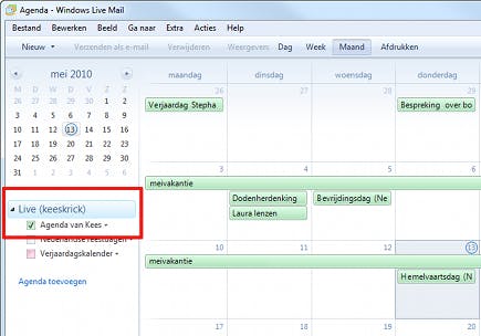 Via een kleine omweg is het mogelijk om de agenda en het adresboek van Outlook over te zetten naar Windows Live Mail. U hebt er het gratis programma Outlook Connector voor nodig, dat wij in een apart kader voor u beschrijven. Zodra u het hebt geïnstalleerd, kunt u de agenda en het adresboek zoals dat in Outlook zit, online plaatsen bij Windows Live. Dat werkt als volgt. Klik in Outlook links in het navigatiedeelvenster op Agenda. Kies dan in de menubalk voor Beeld / Huidige Weergave / Alle afspraken. Klik in het navigatiedeelvenster onder het kopje Mijn agenda's op de agenda van Outlook (meestal Agenda geheten). Soms verspringt de weergave spontaan, zet hem dan opnieuw op Alle afspraken. U ziet nu alleen nog de afspraken van deze ene agenda. Selecteer de afspraken die u naar de online agenda wilt kopiëren en sleep ze met ingedrukte Ctrl-toets naar de agenda van Windows Live. Deze is links onder het kopje Mijn agenda's te vinden. Schakel zodra u hiermee klaar bent via Beeld / Huidige Weergave weer terug naar de door u gewenste agendaweergave, bijvoorbeeld Dag/Week/Maand.