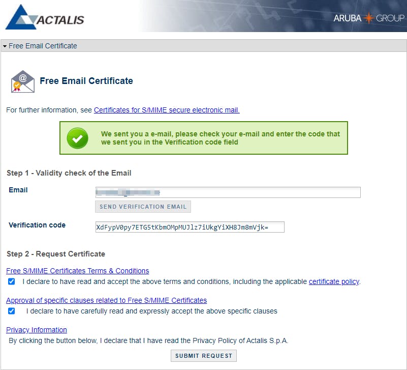Om een certificaat aan te vragen, ga je naar Actalis. In dit online formulier vul je het e-mailadres in waarmee je versleutelde berichten wilt sturen. Plaats een vinkje bij Ik ben geen robot en druk op de knop Send verification mail. Even later ontvang je een bevestigingsmail en vul je de ontvangen code in bij Verification code.