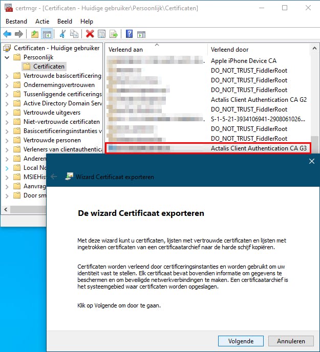 De wizard meldt dat de import is gelukt, maar is dat ook zo? Dat zoek je als volgt uit. Druk op Windows-toets+R en voer certmgr.msc uit. Open de mappen Persoonlijk / Certificaten. In de certificatenlijst hoort nu ook Actalis Client Authentication CA te staan, gekoppeld aan je eerder doorgegeven e-mailadres. Het is geen slecht idee hiervan meteen een back-up te maken. Klik met rechts op dit certificaat en kies Alle taken / Exporteren. De wizard Certificaat exporteren duikt op.