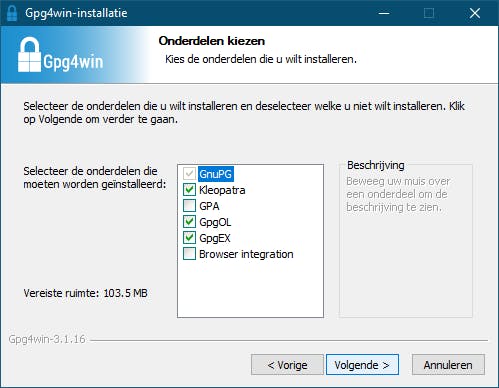 Je start de installatie met een dubbelklik op het gedownloade programmabestand. Druk op Volgende en laat de vinkjes ongemoeid, zodat in ieder geval de onderdelen Kleopatra (de beheermodule voor je digitale certificaat) en GpgOL (plug-in om in Outlook-mails te kunnen versleutelen en ontsleutelen) alvast geïnstalleerd worden.