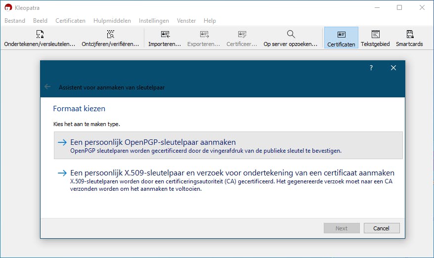 Klik met rechts op het Kleopatra-icoon en kies Open-certificaatbeheerder (indien die niet automatisch opstart). De bedoeling is namelijk dat je nu eerst je eigen sleutelpaar maakt. Klik hiervoor op Bestand / Nieuw sleutelpaar. Vervolgens selecteer je Een persoonlijk OpenPGP-sleutelpaar aanmaken. Houd er wel rekening mee dat je langs deze weg geen erkende CA gebruikt, maar dat je vertrouwt op (de integriteit van) je kennissen – en omgekeerd.