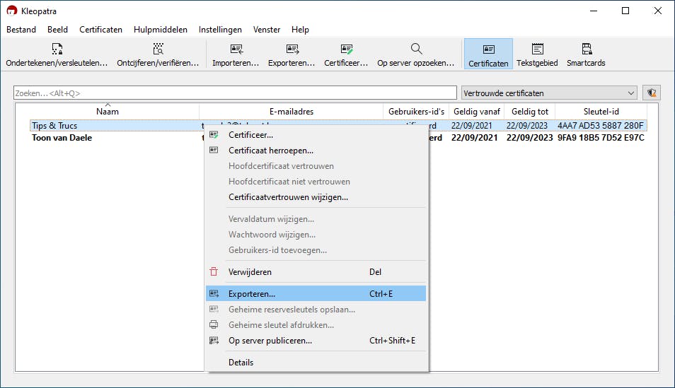 Klik in Kleopatra op het tabblad Certificaten met rechts op je certificaat, kies Exporteren en sla het bestand public.asc op. Dit tekstbestand bezorg je vervolgens aan jouw kennissen of je kunt het zelfs publiceren op een website of een blog.
