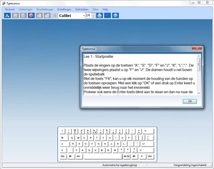 Vlak na de installatie van het programma krijgt u een niveautest voorgeschoteld. Nadat u enkele zinnen zo snel mogelijk - en liefst foutloos - hebt overgetypt, bepaalt Typecursus op uw PC uw typeniveau. Gelukkig is dit slechts een advies en kunt u later nog zelf aangeven met welk niveau u van start wenst te gaan. Beginners kunnen aan de hand van de verschillende lessen en oefeningen echt blind leren typen terwijl gevorderden hun typesnelheid kunnen opkrikken of het aantal fouten kunnen verlagen. U kunt kiezen om bepaalde toetsen te oefenen (fffjjj-oefeningen) of standaardteksten over te typen (van gedichten en brieven tot artikels in vreemde talen). Tijdens onze test ging het met de dictees wel eens fout. Het geluid haperde soms en vaak moesten we eindeloos wachten op een nieuwe zin. Helaas zat deze bug ook al in de vorige versie van dit programma.