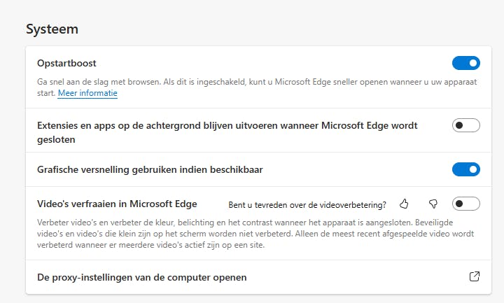 Om dit ongewenste gedrag te voorkomen, open je Edge en klik je op de drie puntjes in de rechterbovenhoek. Selecteer Instellingen in het menu. Of je tikt edge://settings/system in het adresvak en drukt op Enter. In de instellingen kies je Systeem en prestaties. Zet de schakelaar uit bij Extensies en apps op de achtergrond uitvoeren wanneer Microsoft Edge wordt gesloten.