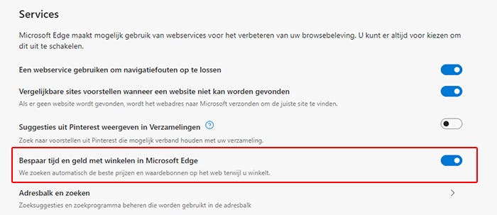 Ga vervolgens opnieuw naar Instellingen, maar dit keer naar het menu Privacy, zoeken en services. Je ziet dat er nu een schuifje aan staat bij Bespaar tijd en geld met winkelen in Microsoft Edge. Dit is de setting voor zogeheten coupons, die je eventueel hier dus ook weer kunt uitschakelen. Voor het geval je geen trek hebt in de pop-ups.