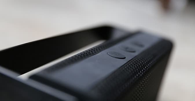 Onder het handvat vinden we drie knoppen; eentje voor aan/uit en Bluetooth bediening en twee voor het aanpassen van het volume.