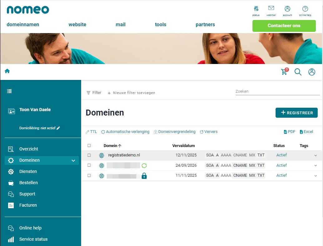 Het dashboard bij registrar Nomeo met het domeinoverzicht.