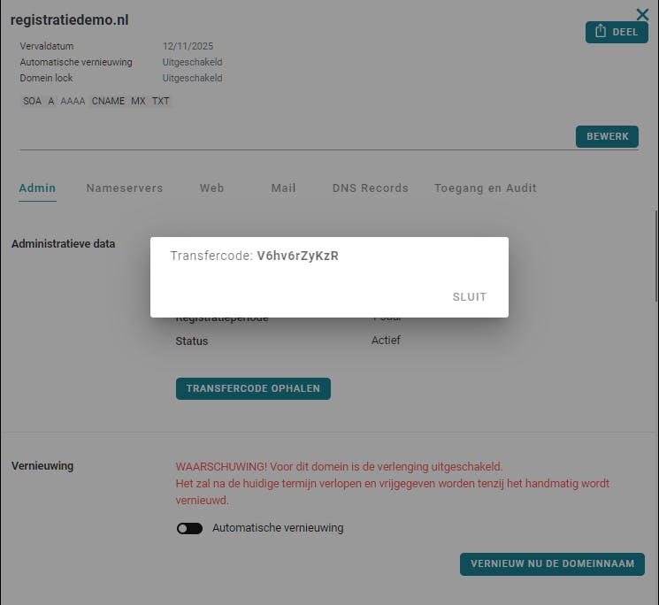 Voor een domeinverhuizing naar een andere registrar heb je een transfercode nodig.