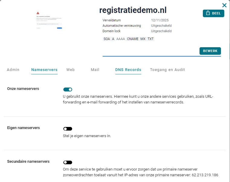 Deze nameservers beheren de DNS-records, die de nodige informatie bevatten om diensten zoals je website en e-mail met de juiste servers te verbinden. Wanneer iemand bijvoorbeeld registratiedemo.nl bezoekt, wordt er eerst contact gemaakt met de nameservers die zijn ingesteld voor dat domein. Deze versturen vervolgens de benodigde DNS-records, zodat de bezoeker op de juiste website terechtkomt. DNS-records worden opgeslagen in een database of in zogeheten zonebestanden op de nameserver.