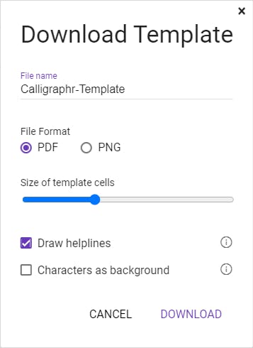 Ben je hiermee klaar klik dan bovenaan op Download Template. Je mag de standaardinstellingen behouden (PDF en Draw helplines) en je bevestigt met Download. Klik op Calligraphr-Template.pdf om het pdf-document op te halen en druk beide pagina’s af op papier. Schrijf in elk van de 72 vakjes het bijbehorende teken, bij voorkeur met een redelijk dunne, diepzwarte stift. Blijf ook mooi binnen de hulplijnen voor de zogeheten staartletters (zoals g, j en p) en stokletters (zoals b, d en f).