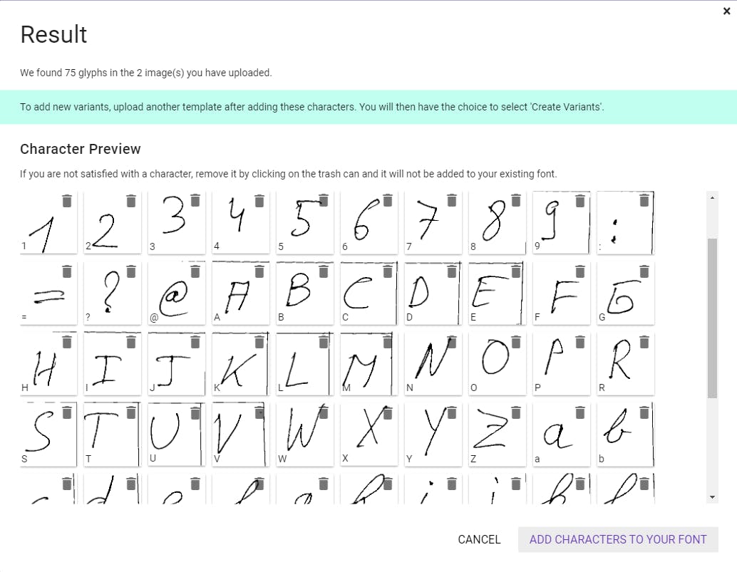 Vervolgens kies je Add characters to your font. Je krijgt nu een goed beeld van elk teken en als je dit wenst kun je specifieke tekens uit je font halen via het prullenbak-icoon. Is alles naar wens, klik dan op Edit Font Details, geef je font een naam en pas eventueel de spatiëring aan (je kunt bijvoorbeeld de Letter spacing wat verkleinen). Bevestig met Save, klik daarna op Build Font en op Build. Klik bovenaan op de bestanden .ttf en/of .otf om je font te downloaden. In stap 13 vertellen we je hoe je dit font op je pc installeert.