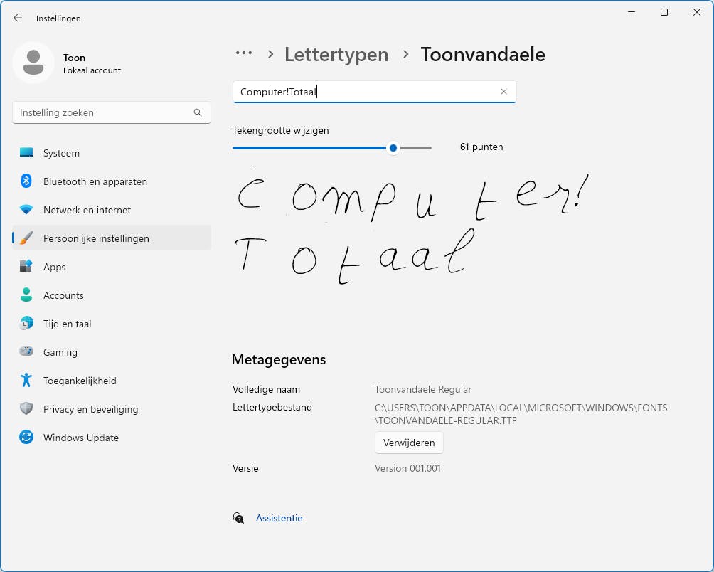 Je hebt nu een of meer fontbestanden op je pc gedownload of gemaakt. Om die in Windows daadwerkelijk als font te installeren, volstaat het in Verkenner met de rechtermuisknop op zo’n ttf- of otf-bestand te klikken en Installeren of Installeren voor alle gebruikers te selecteren. Als het goed is, komt het font al meteen beschikbaar in je favoriete tekstverwerker, zoals Word of WordPad. Om het font beter te bekijken of weer te verwijderen, druk je op de Windows-toets, tik je lettertype in en start je Lettertype-instellingen op.