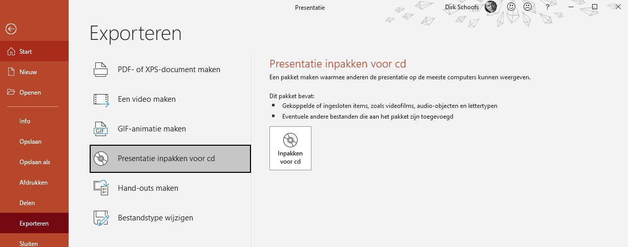 Open in de tab Bestand de optie Exporteren. Daarna kies je de opdracht Presentatie inpakken voor cd. Dit lijkt misschien wat raar, want je was waarschijnlijk niet van plan om je presentatie op zo’n ouderwetse schijf te branden. Maar toch moet je deze weg volgen, want de keuze voor het uiteindelijke opslagmedium maak je later.