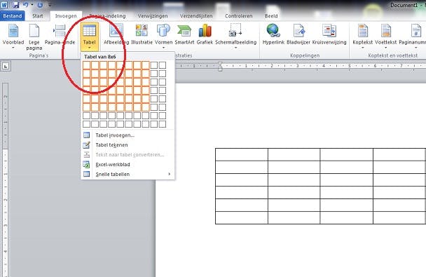 Een tabel invoegen gaat via de knop Invoegen, en vervolgens krijg je een drop-down in Tabel. In dat menuutje krijg je een grafische weergave voorgeschoteld van het gewenste aantal rijen en kolommen.
