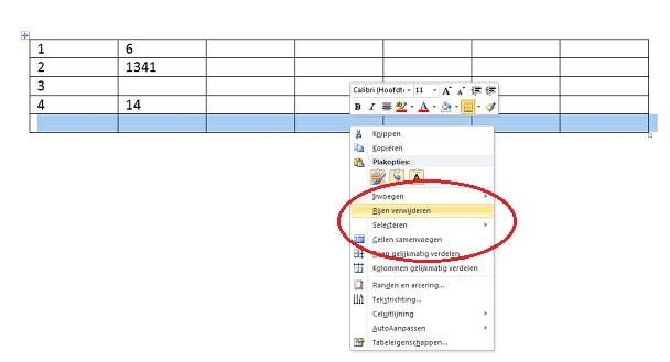 Als je de tabel hebt ingevoegd, kun je natuurlijk nog rijen en kolommen verwijderen. Dat gaat eigenlijk helemaal niet zo heel handig in Word: je moet de rij selecteren en vervolgens met de rechtermuisknop in het menu gaan kiezen wat je wilt doen. Het is daarom handiger om direct het goede aantal rijen te kiezen in de vorige stap.